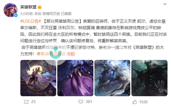 英雄联盟为什么宣布暂时禁用四个英雄